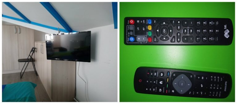 Our small but comfy studio has a TV. There are two remotes for it- one for turning on the TV and playing with its settings (Philips), and the other one is for the receiver (you'll recognize it by the Mtel label) - you browse the channels from it. Make sure the receiver is turned on and that the TV's source is on HDMI.